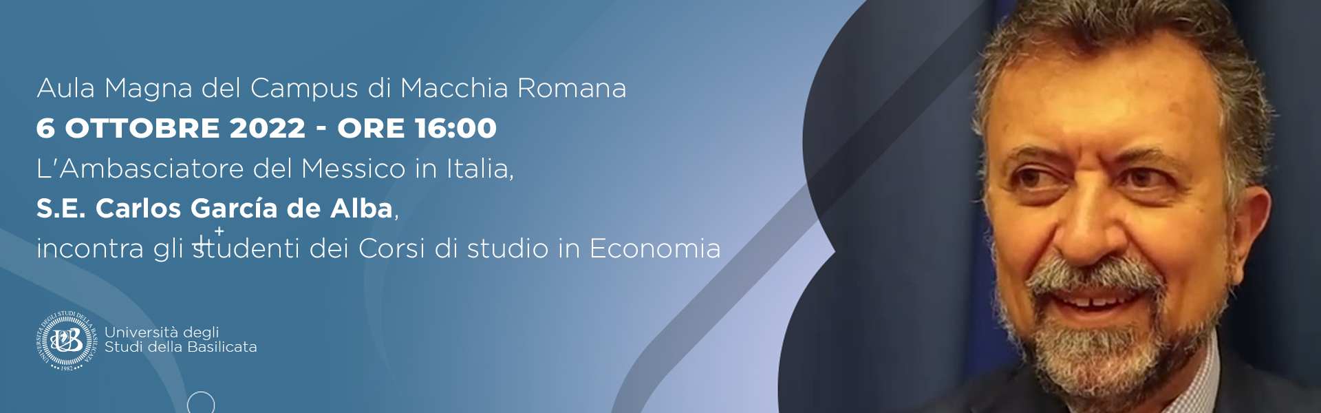 SE Carlos Garcìa de Alba, Embajador de México en Italia, se reunirá en Potenza el jueves 6 de octubre de 2022, Ala Magna del campus de la Universidad de Basilicata (a las 16:00 horas) como parte de una visita institucional a Basilicata. Los estudiantes de economía deben visitar Basilicata para discutir las relaciones entre México, Europa e Italia desde una perspectiva económica y sociopolítica. El Embajador estará acompañado por Francesco Maltarizzi, Cónsul Honorario de Puglia y Basilicata, México. |