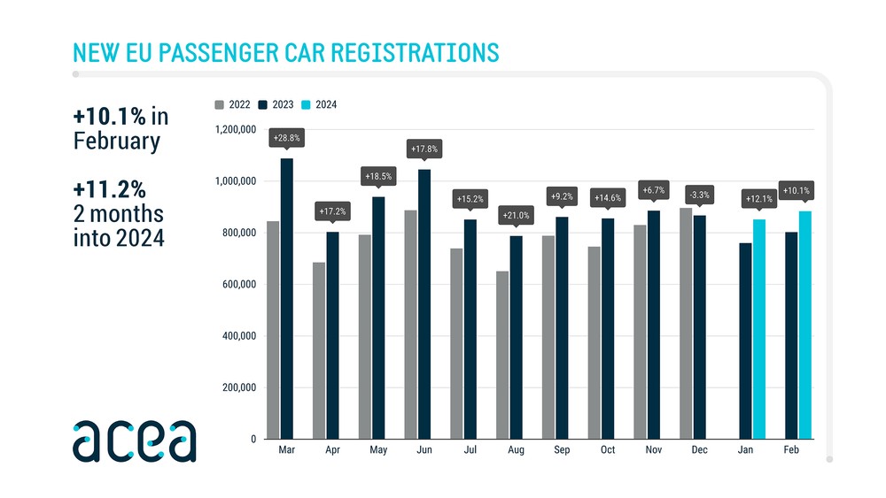 Para el mercado automovilístico europeoel febrero 2024 Terminó con Signo positivo. Según datos de ACEA, en la Unión Europea se produjeron 883.608 matriculaciones, frente a las 802.435 del mismo periodo de 2022. Hablamos de una 10,1% de crecimiento. Volvendo también incluye el Reino Unido y los países de la AELC, y las matriculaciones aumentaron hasta 995.059 (+10,2% en 2022 con 902.878 unidades matriculadas).