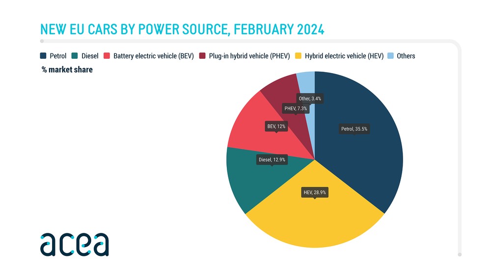 En febrero de 2024, los coches eléctricos alcanzaron una cuota de mercado del 12% (estable respecto al 12,1% de febrero de 2023), mientras que los coches híbridos alcanzaron una cuota de mercado de aproximadamente el 29%. La cuota de mercado combinada de los coches de gasolina y diésel alcanzó el 48,4%, frente al 51,9% del año pasado.